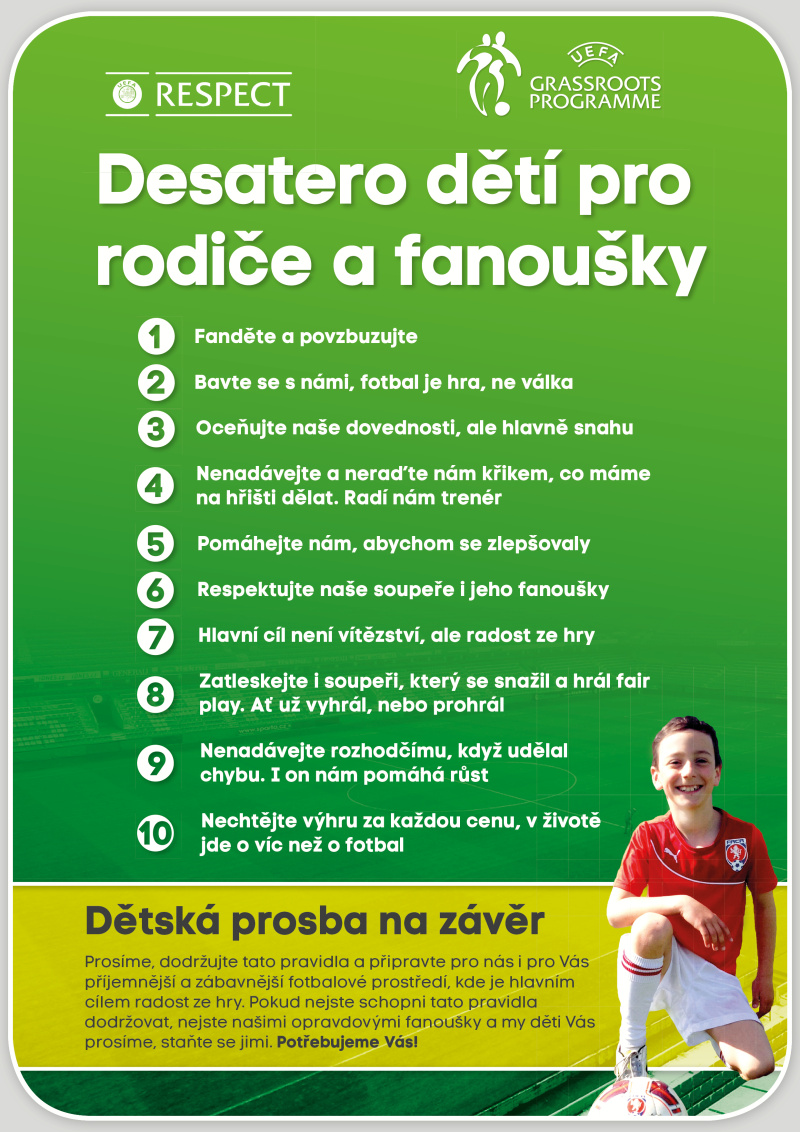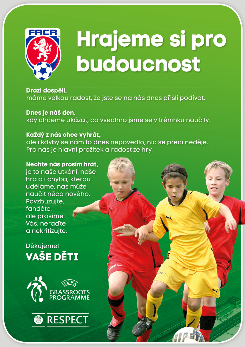 - Výbava na trénink: míč č. 4, sportovní oblečení, kopačky/turfy, vysoké ponožky, pití, šusťáková bunda